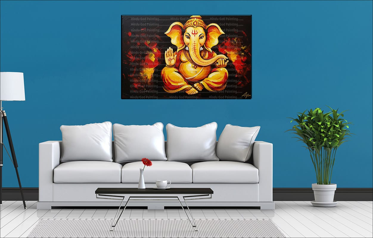 Invite auspicious energy into your space with this powerful canvas art. Lord Ganesh is depicted seated in a radiant golden glow, accented by fiery bursts against a dark, textured background with subtle text. This Fiery Aura Ganesh Canvas emanates strength, positivity, and divine blessings.