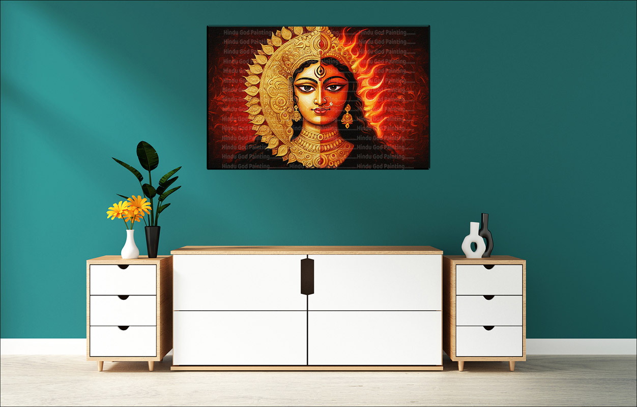 - High-Resolution Print: Captures the striking details of Goddess Durga’s face, the fiery aura, and the intricate golden jewelry.