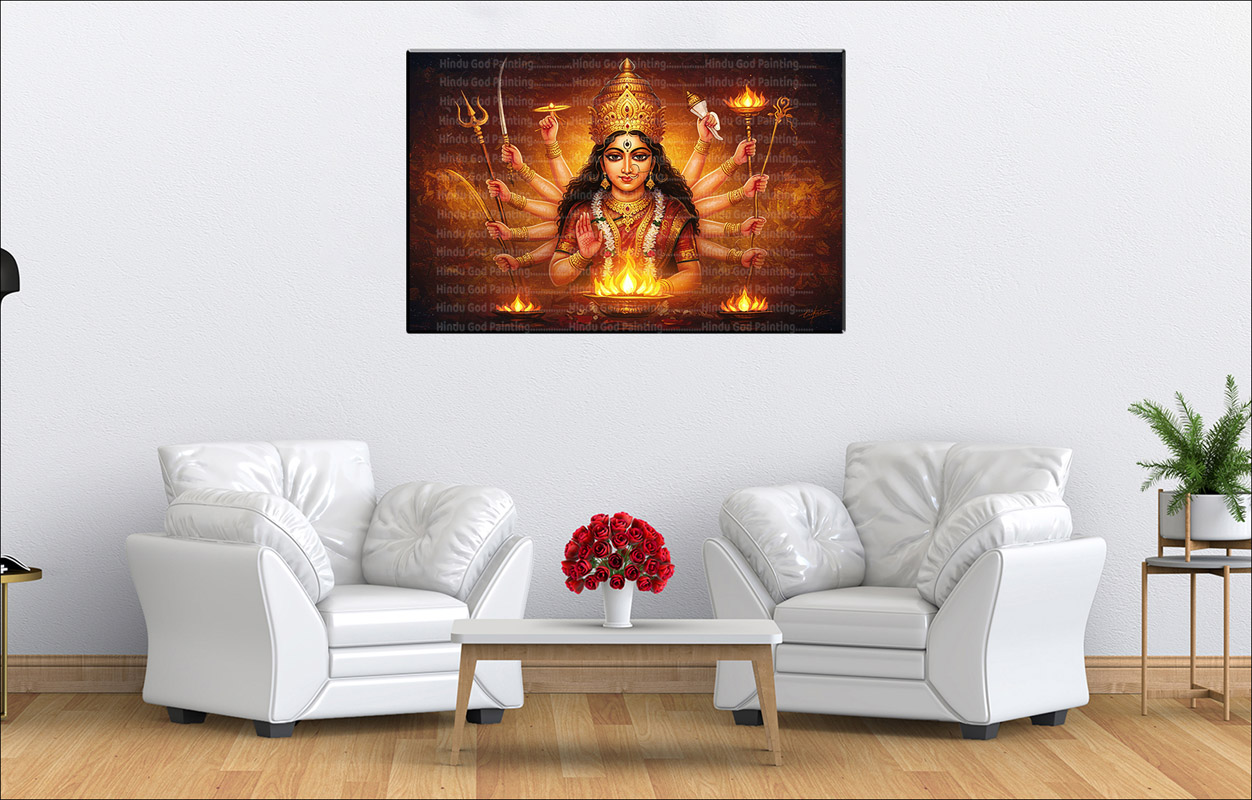 Invite intense divine power and protection into your space with this majestic canvas art. Goddess Durga is depicted seated regally, with her multiple arms holding an array of symbolic weapons. A fierce fiery aura surrounds her, signifying her immense power and energy. The artwork is set against a textured background with subtle text. This Fiery Durga Seated Canvas embodies strength, courage, and the formidable energy of the divine feminine.