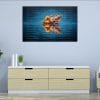 Invite auspicious joy into your space with this delightful canvas art. Lord Ganesh is depicted playfully floating on the surface of blue water, complete with his reflection. The artwork is set against a textured blue background with subtle text. This Floating Ganesh Canvas radiates positivity and lighthearted blessings.