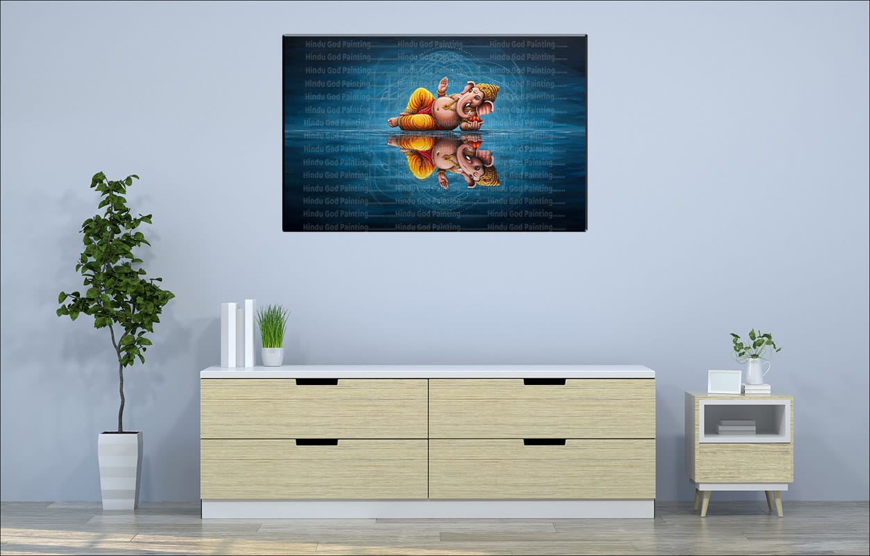 - High-Resolution Print: Captures the joyful image of Lord Ganesh floating on water with his reflection against the textured blue background.