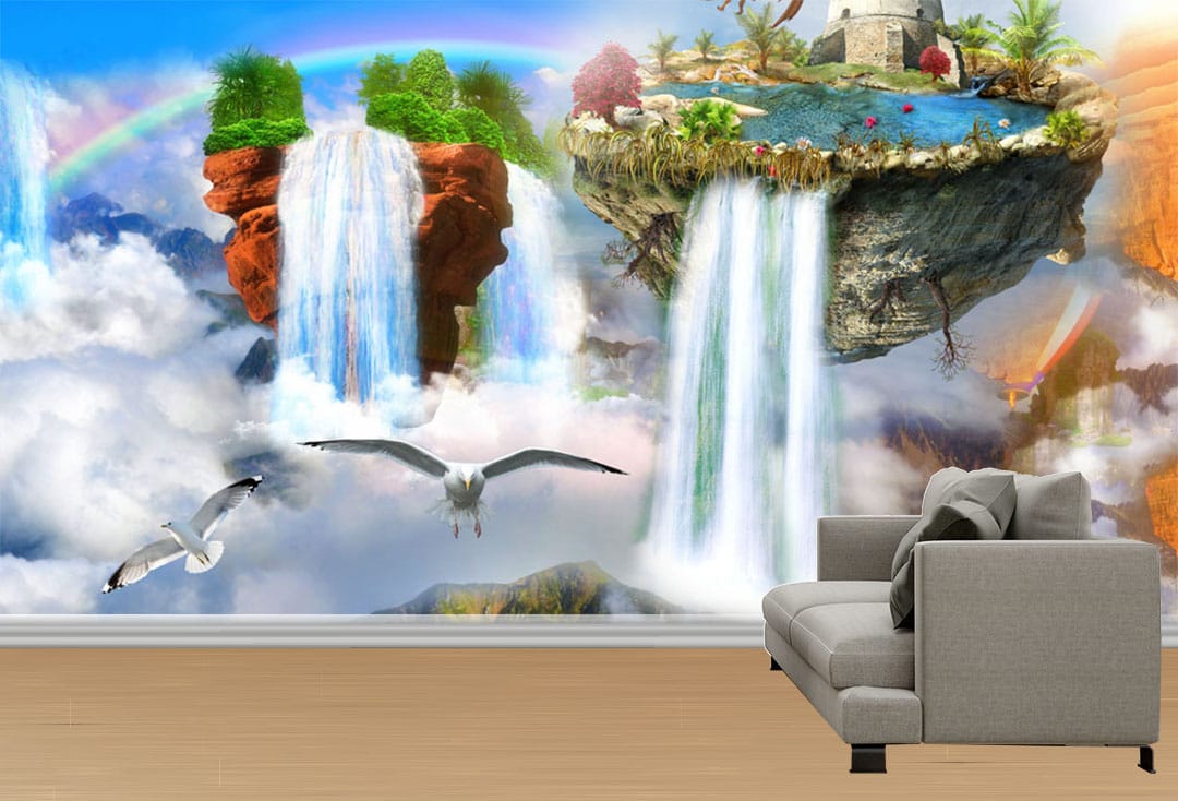 Transform your wall with the enchanting Floating Waterfall Islands Mural Print. This imaginative design features fantastical floating islands adorned with lush greenery, cascading waterfalls, and charming structures. Rainbows arch through the misty air, and graceful seagulls soar between the islands, creating a whimsical and breathtaking dreamscape that brings a touch of magic to any space.