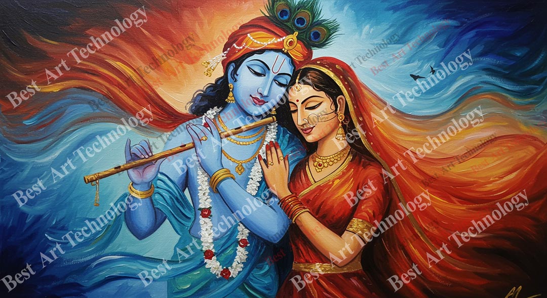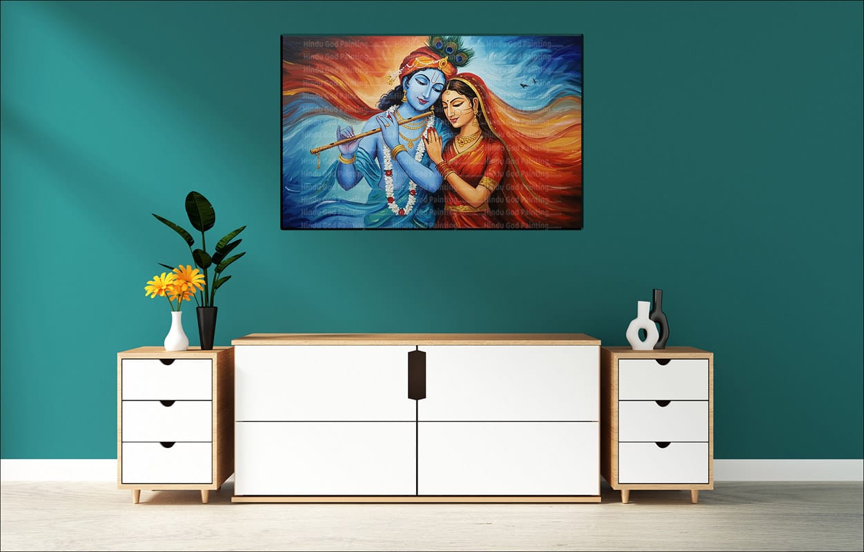- High-Resolution Print: Captures the colorful portrait of Radha and Krishna and the energetic flowing abstract background.