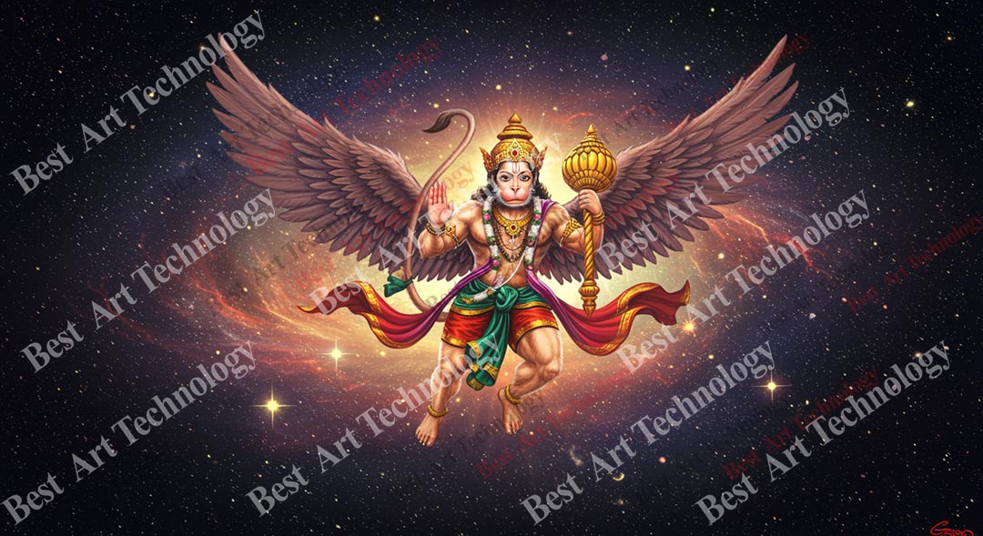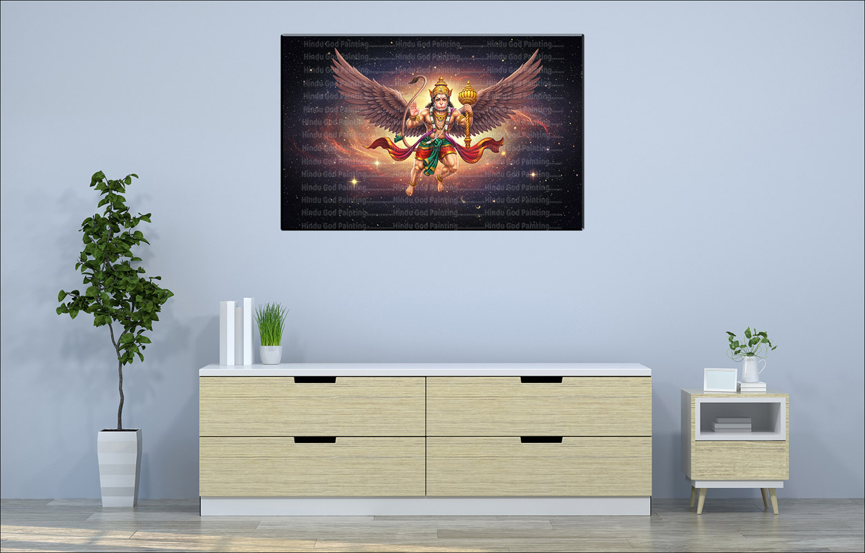 - High-Resolution Print: Captures the dynamic flight of Lord Hanuman carrying the mountain against the detailed cosmic background.
