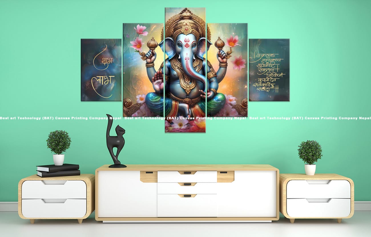Infuse your space with serene blessings through the Ganesh Blue Sanskrit Floral Canvas. This multi-panel artwork features Lord Ganesh in calming blue tones, accented with floral elements and elegant Sanskrit text, blending divine imagery with tranquil artistry.