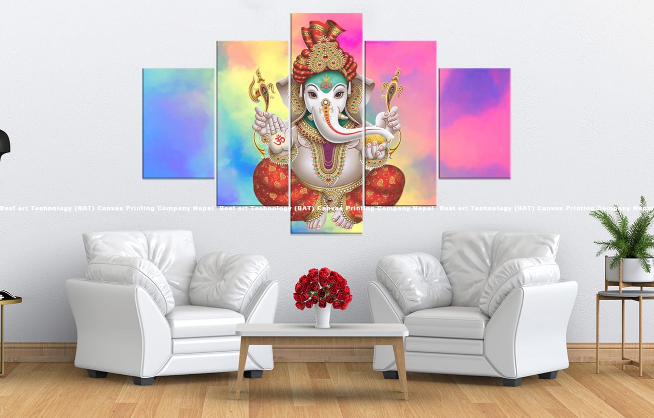 Add a touch of modern divinity with the Ganesh Colorful Abstract Canvas. This multi-panel artwork features Lord Ganesh against a vibrant, abstract background, blending spiritual symbolism with contemporary artistic expression.