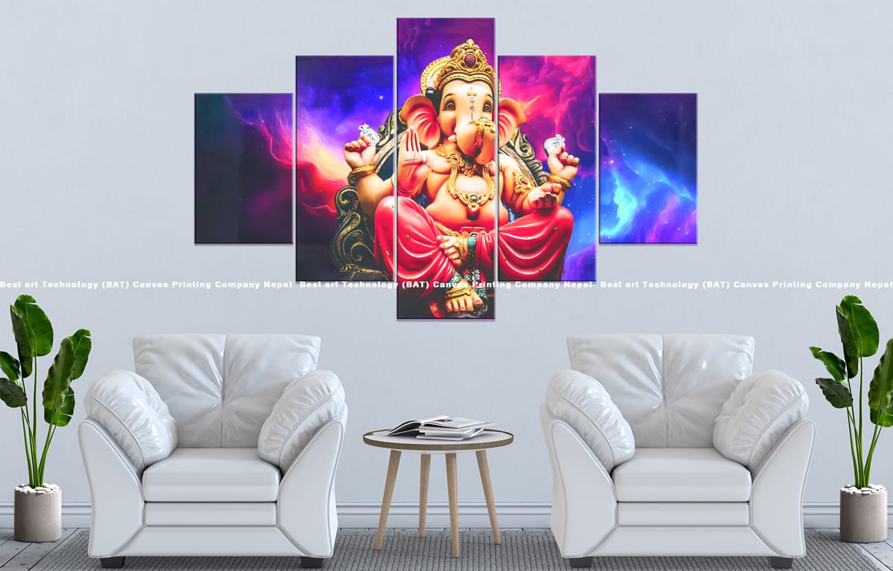 Add a touch of celestial divinity with the Ganesh Nebula Canvas. This multi-panel artwork features Lord Ganesh against a stunning nebula-like space background, blending spiritual symbolism with cosmic artistry.
