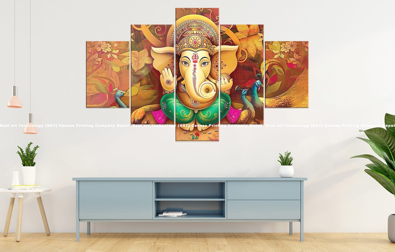 Add a vibrant spiritual accent with the Ganesh Peacock Floral Canvas. This multi-panel artwork features Lord Ganesh with rich peacock and floral elements, blending divine imagery with colorful artistic expression.