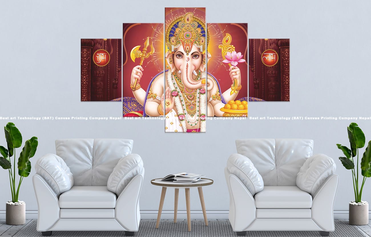 Add a touch of sacred sanctuary with the Ganesh Temple Red Canvas. This multi-panel artwork features Lord Ganesh against a rich red temple-like background, blending divine imagery with traditional architectural elements.
