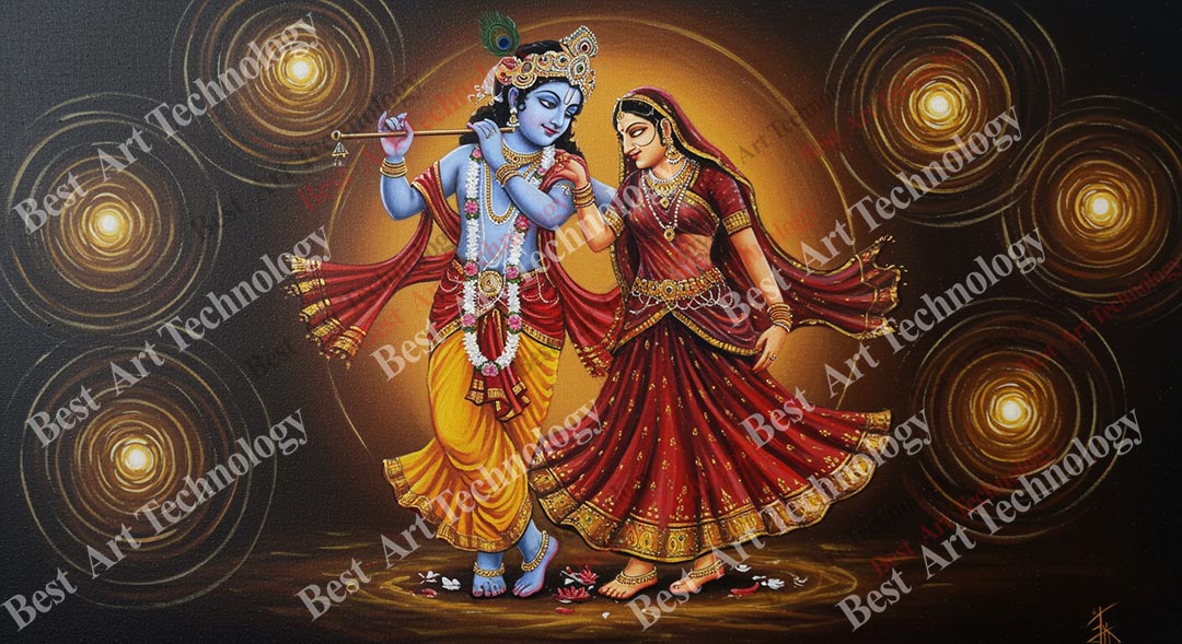 - High-Resolution Print: Captures the joyful dance of Radha and Krishna and the radiant glowing golden circles.