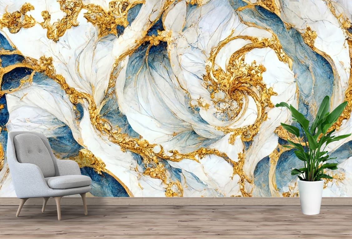 Add a touch of elegance and sophistication to your space with our Gold Swirl Marble Abstract Mural Print. Featuring luxurious gold swirls flowing across a backdrop of soft white and calming blue marble textures, this mural captures the beauty of fluid motion and modern artistry.