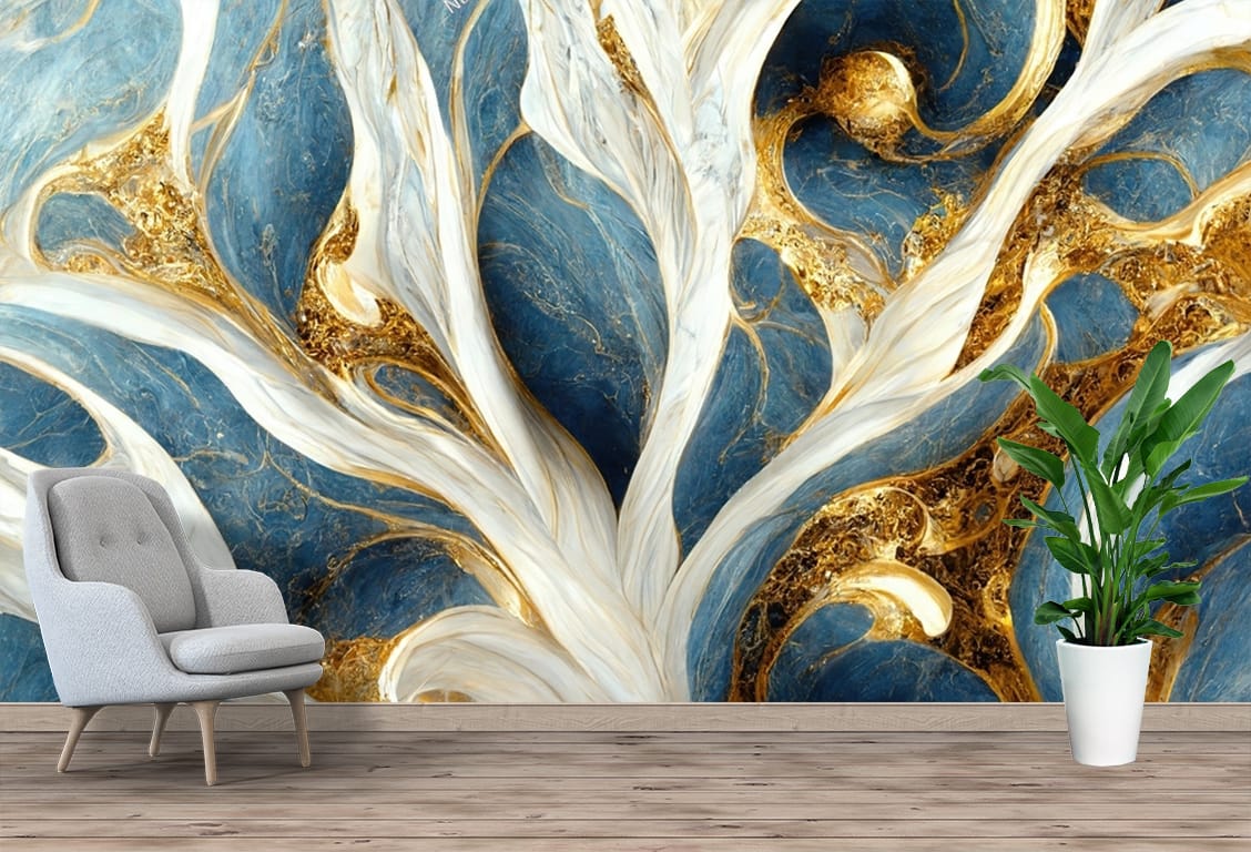 Elevate your interior with the luxurious elegance of our Gold Vein Marble Abstract Mural Print. This stunning wall mural features bold, flowing gold veins seamlessly woven through a rich marble texture of deep blue and crisp white tones. The dynamic contrast and fluid patterns create a striking sense of movement, depth, and refinement.