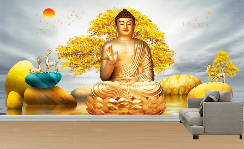 Transform your wall with the Golden Buddha Golden Tree Wallpaper. This serene design depicts a radiant golden Buddha seated in meditation on a golden lotus, beneath a stylized golden tree with shimmering leaves. The tranquil landscape includes soft water reflections, abstract golden rock formations, and graceful deer, creating a peaceful and spiritually uplifting atmosphere in any room.