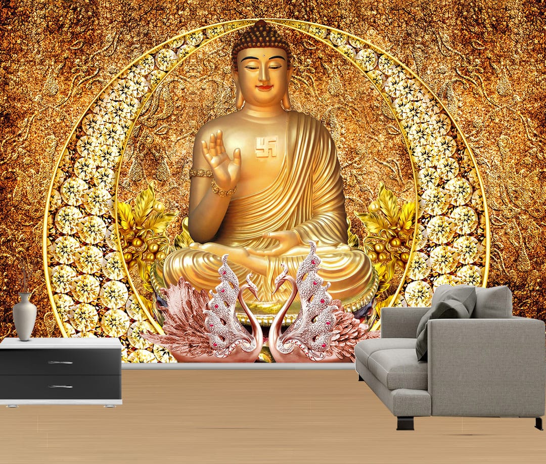 Transform your wall with the Golden Buddha Ornate Wallpaper. This luxurious design depicts a serene golden Buddha seated in meditation, framed by elaborate and intricate golden patterns, floral motifs, and sparkling accents. The rich gold and detailed ornamentation create an atmosphere of peace, reverence, and spiritual in any room.