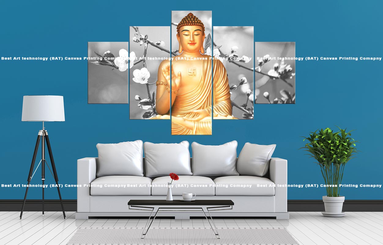 Bring a sense of radiant peace and the delicate beauty of spring to your space with this luminous multi-panel canvas print. The artwork features a golden Buddha in a serene meditative pose, surrounded by delicate white plum blossoms set against a contrasting grayscale background, all spread across five panels. This Golden Buddha Plum Blossoms Canvas will infuse your home with a calming and elegant atmosphere.