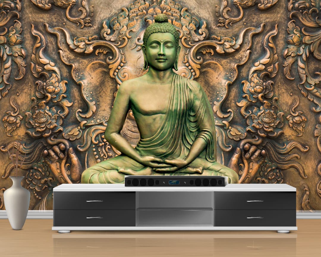 - Premium Quality Mural: High-resolution design featuring a green Buddha statue and an ornate carved background.