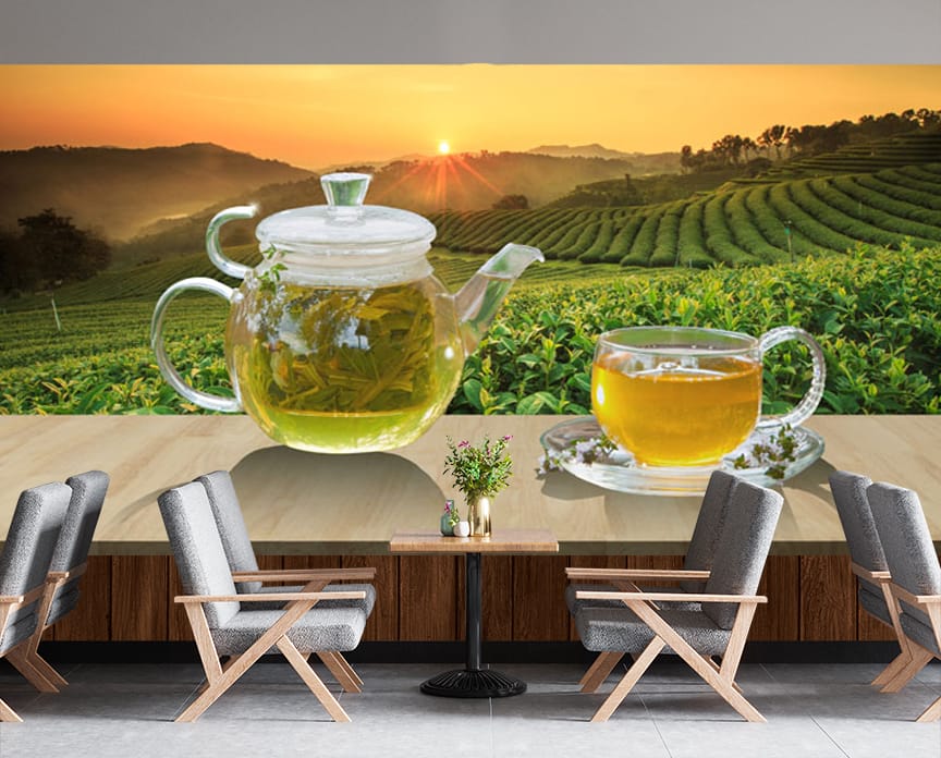 ransform your cafe or tea house in Nagarjun, Bagmati Province, Nepal, with our Green Tea Mural Print. This mural features a calming design with a glass teapot and teacup filled with green tea, set against a backdrop of a scenic tea field at sunrise. The serene and natural design is perfect for creating a relaxing tea-drinking atmosphere, ideal for attracting local customers seeking a peaceful escape. High-quality prints ensure a lasting and visually appealing decor. Perfect for enhancing the customer experience and showcasing your tea selection, it adds a touch of nature to your Nagarjun establishment. Custom Canvas Print Nepal options are available. Explore our collection of tea and nature murals for more calming and stylish designs, tailored for businesses in Nepal.