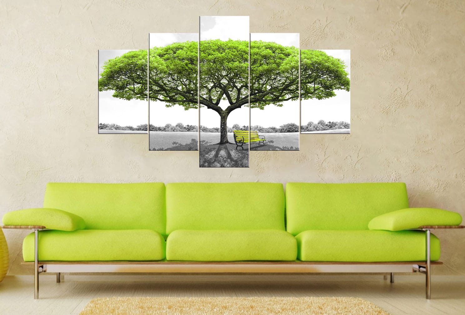 - Premium Quality Canvas Print: High-resolution multi-panel design featuring a green tree and yellow bench in a black and white setting.
