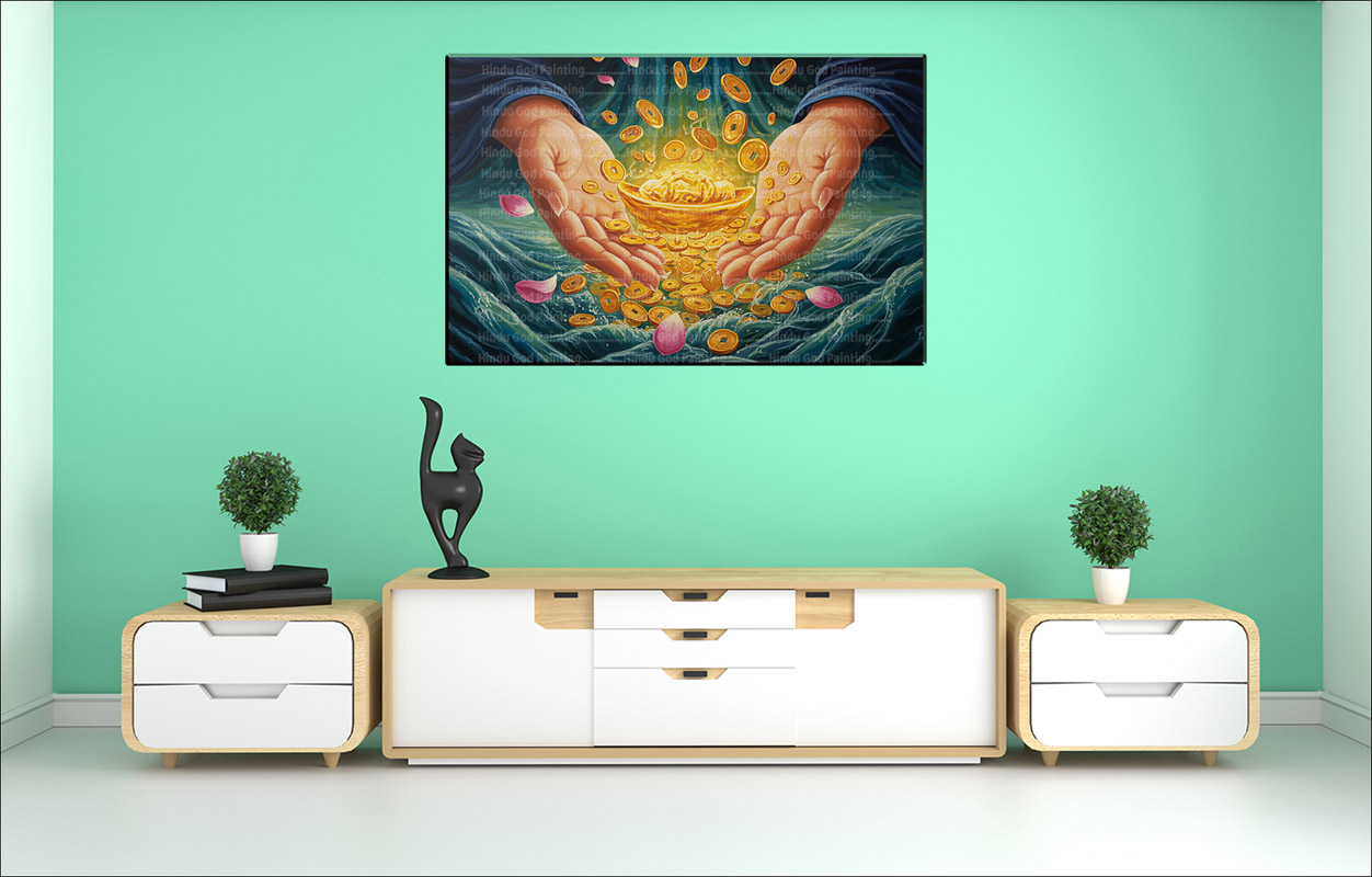 • High-Resolution Print: Captures the detailed image of the hands, the golden coins, the pot, and the falling lotus petals.