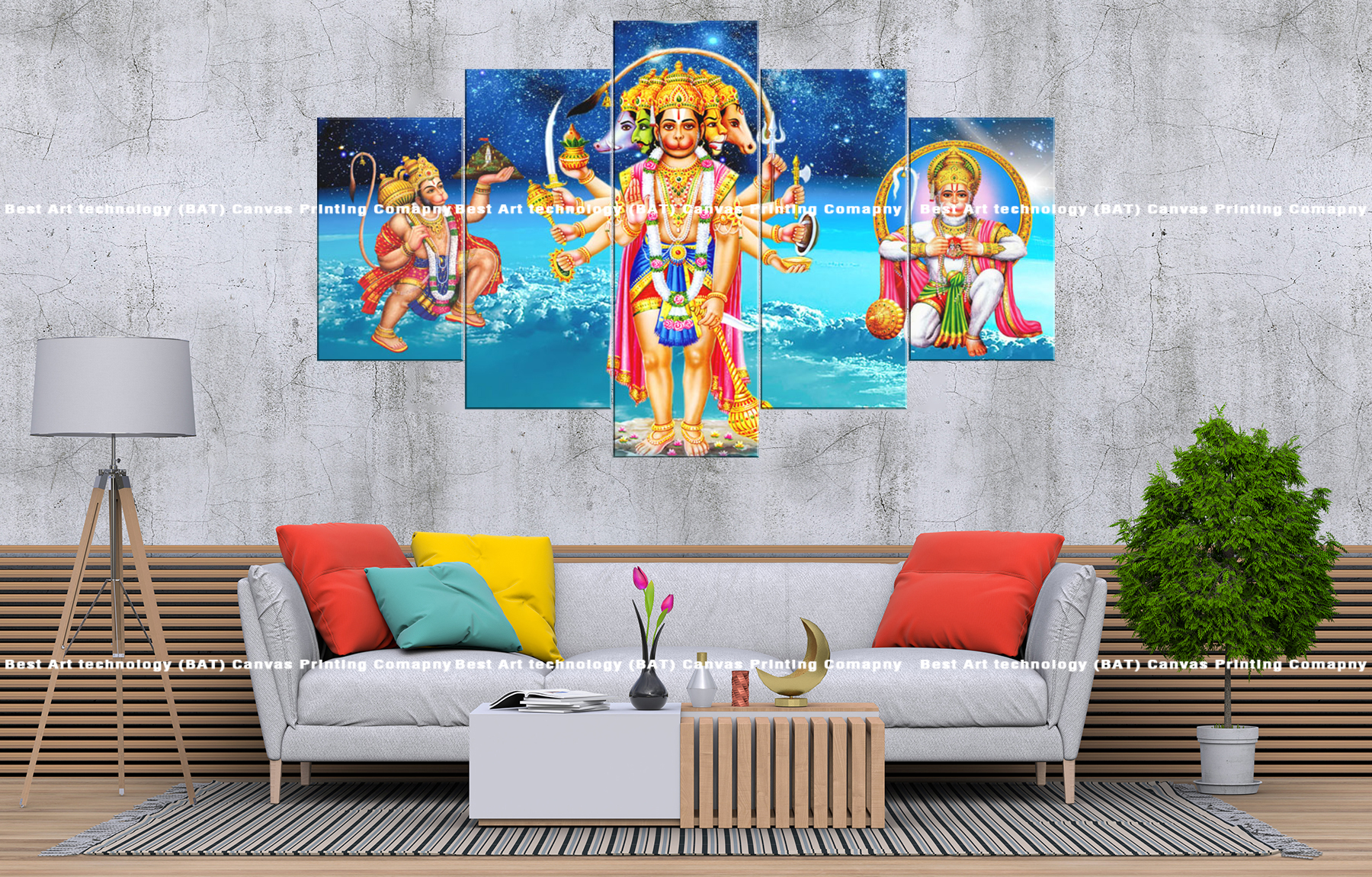 Transform your living room or prayer space with the Hanuman Divine Canvas. This stunning multi-panel canvas print features Lord Hanuman at the center, flanked by Lord Ram and Goddess Sita, symbolizing strength, devotion, and the divine narrative of the Ramayana. The vibrant colors and detailed depictions create a spiritually powerful atmosphere.