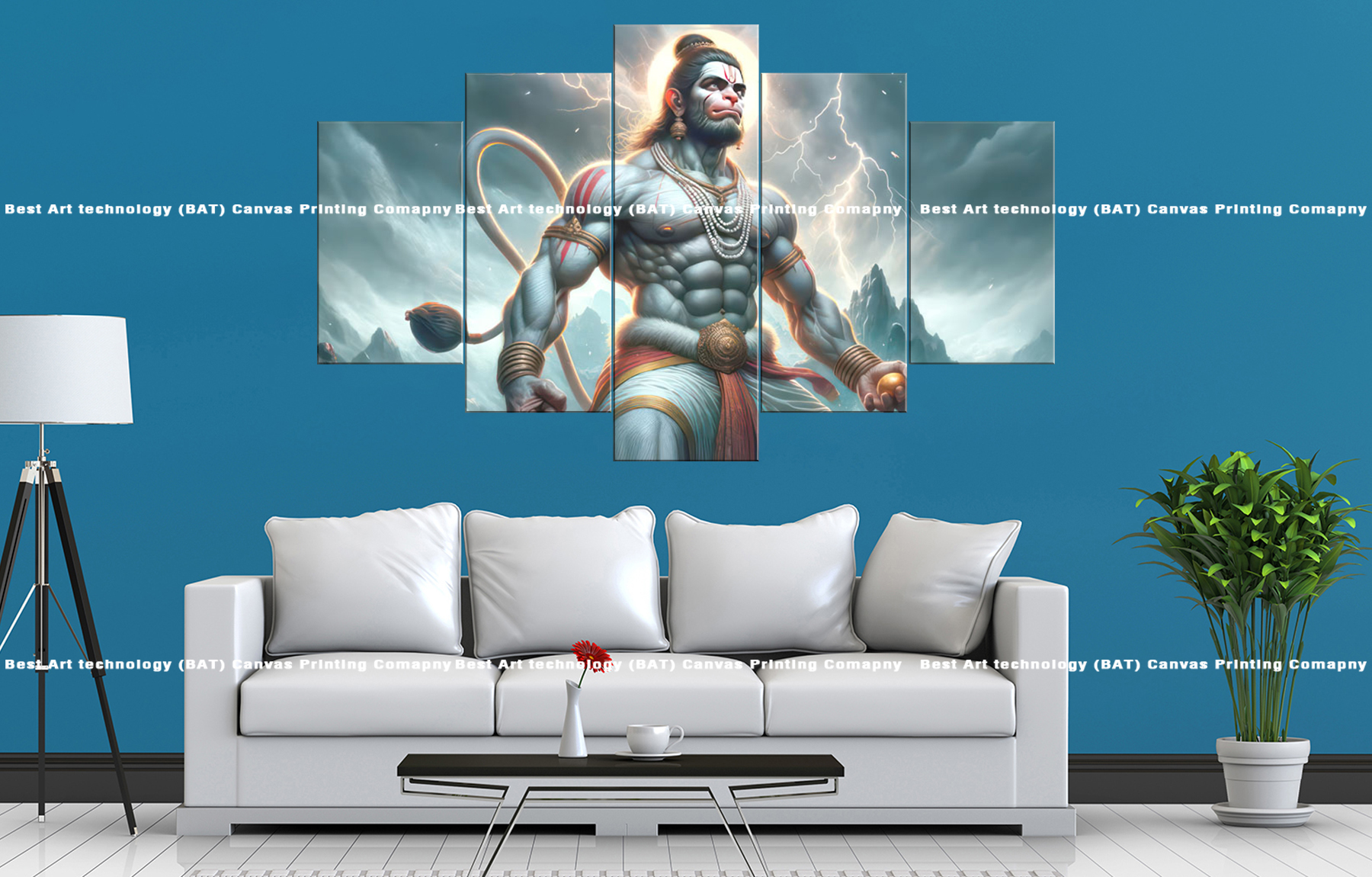 Transform your living room or prayer space with the Hanuman Thunder Power Canvas. This striking multi-panel canvas print features Lord Hanuman in a powerful stance amidst thunderous lightning, symbolizing divine strength, energy, and unwavering devotion. The detailed rendering and dynamic composition create a powerful and awe-inspiring spiritual atmosphere.