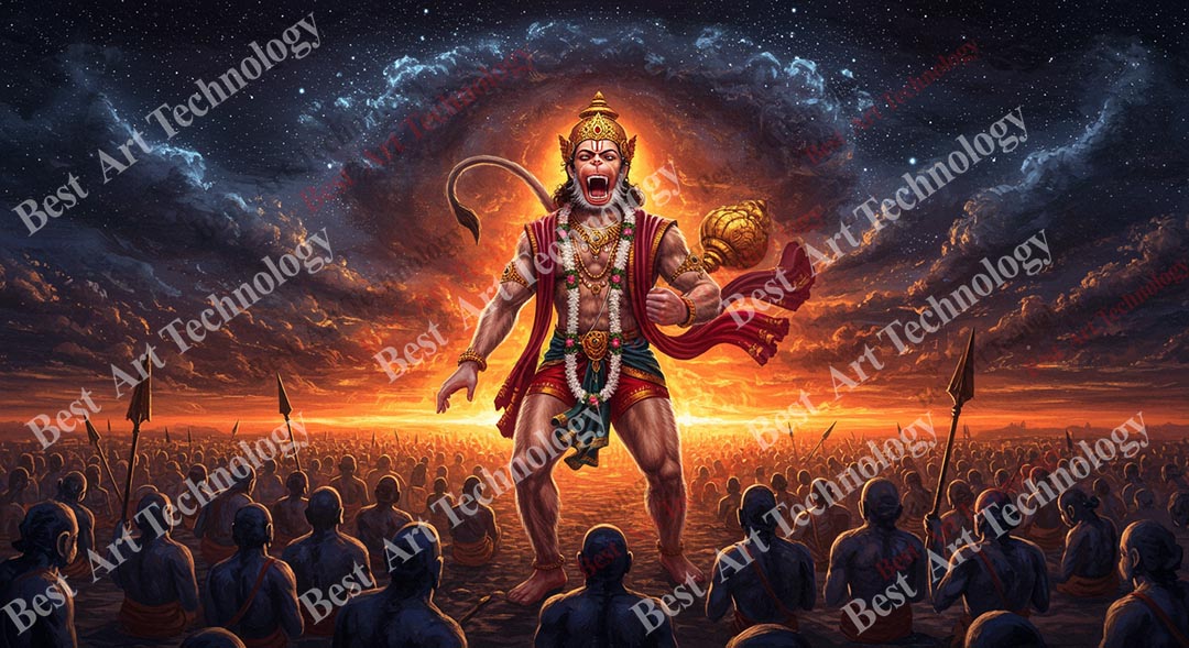 Invite courage and leadership into your space with this powerful canvas art. Lord Hanuman is depicted standing heroically before a gathering army, under a dramatic fiery sky with celestial touches. This Heroic Hanuman Army Canvas embodies bravery and strength.