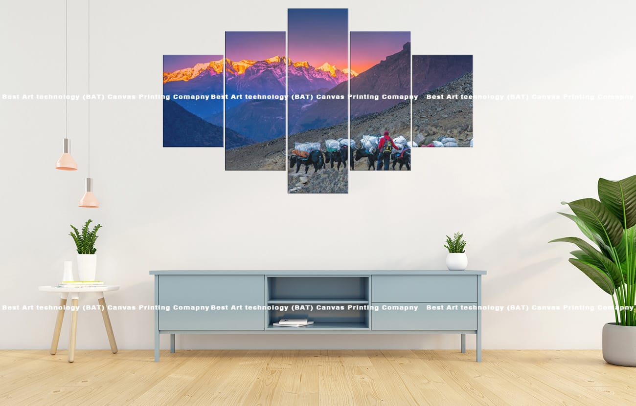 Transform your space with the majestic Himalayan Caravan Canvas Print. This multi-panel canvas art captures a timeless scene of a caravan with yaks and porters traversing a rugged mountain pass in the breathtaking Himalayas, bathed in the warm hues of dawn or dusk. Experience the grandeur of the Nepali mountains.
