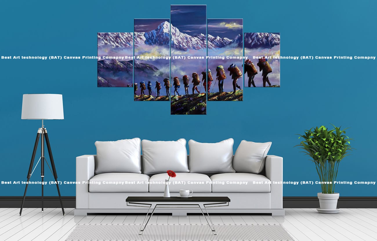 - Premium Quality Canvas Print: High-resolution multi-panel painting of trekkers in the Himalayas.