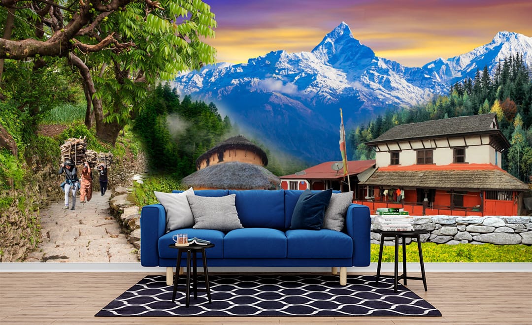 ransform your wall with the breathtaking Himalayan Village Mountain View Mural Print. This design captures a picturesque scene from a traditional Nepali village nestled in the foothills of the majestic Himalayas. Snow-capped peaks rise dramatically in the background under a vibrant sunset sky. The foreground features traditional houses, lush greenery, and local people carrying goods along a stone path, offering a glimpse into the rich culture and stunning landscapes of Nepal.