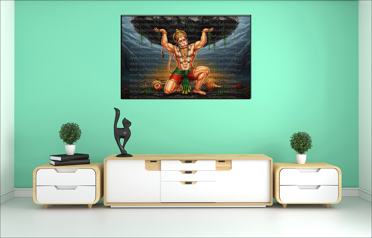 • High-Resolution Print: Captures the powerful depiction of Lord Hanuman kneeling and supporting the massive boulder.