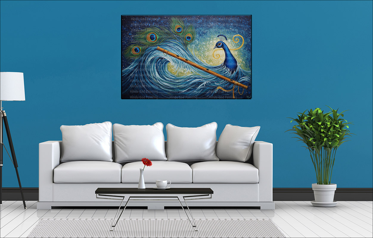 Invite the artistic representation of Lord Krishna’s divine music into your space with this captivating canvas art. Krishna’s flute rests gracefully on stylized blue waves, beautifully adorned with vibrant peacock feathers and a stylized peacock. This Krishna Flute Waves Peacock Canvas embodies melody, beauty, and divine artistry.