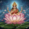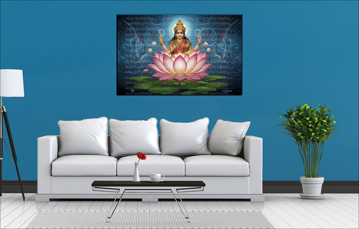 • High-Resolution Print: Captures the radiant image of Goddess Lakshmi, the lotus flower, and the showering golden coins against the textured blue background.
