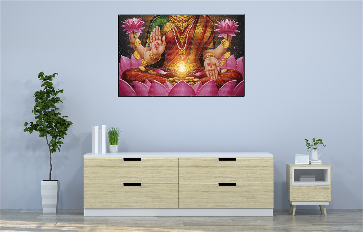 - High-Resolution Print: Captures the radiant image of Goddess Lakshmi, the lotus flower, the showering golden coins, and the held lotuses.