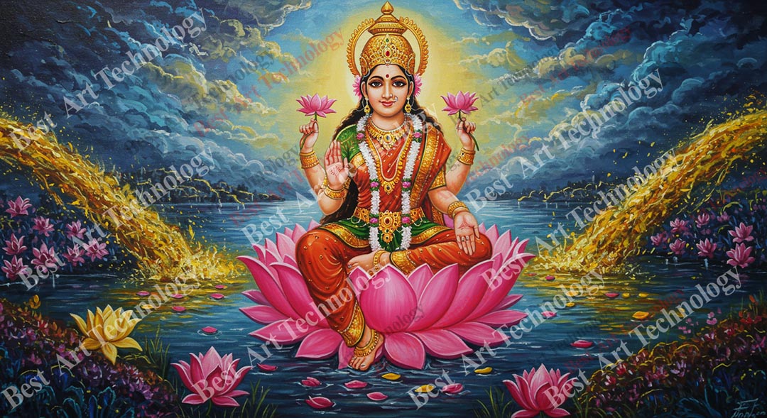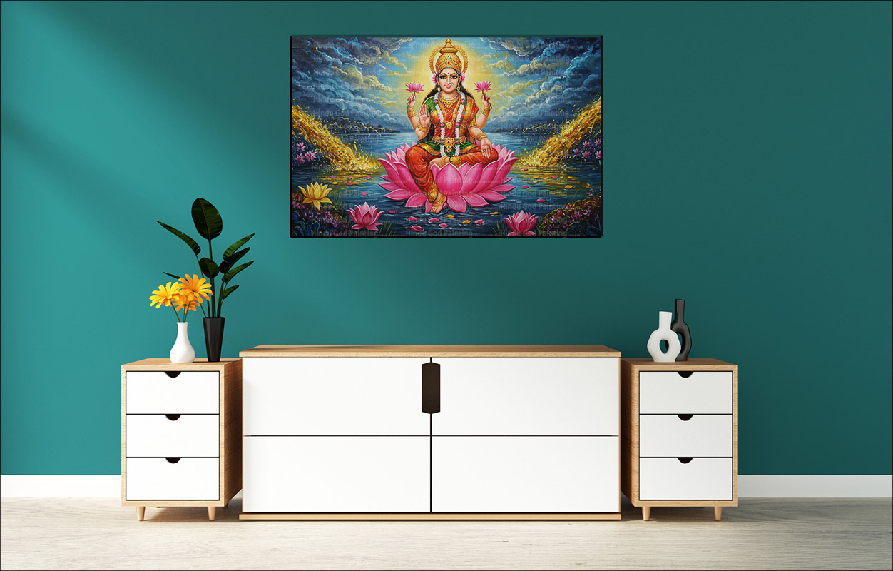 - High-Resolution Print: Captures the serene image of Goddess Lakshmi, the lotus flower, the golden coins, the peaceful lake, and the vibrant landscape.