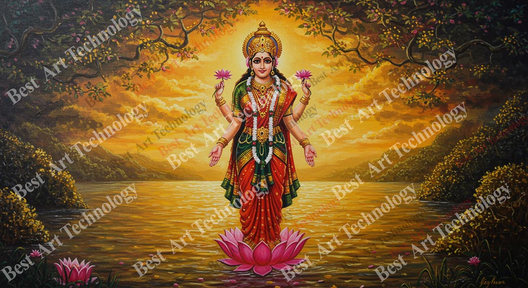 - High-Resolution Print: Captures the enchanting image of Goddess Lakshmi, the lotus flower, the golden coins, the serene lake, and the sunset landscape.