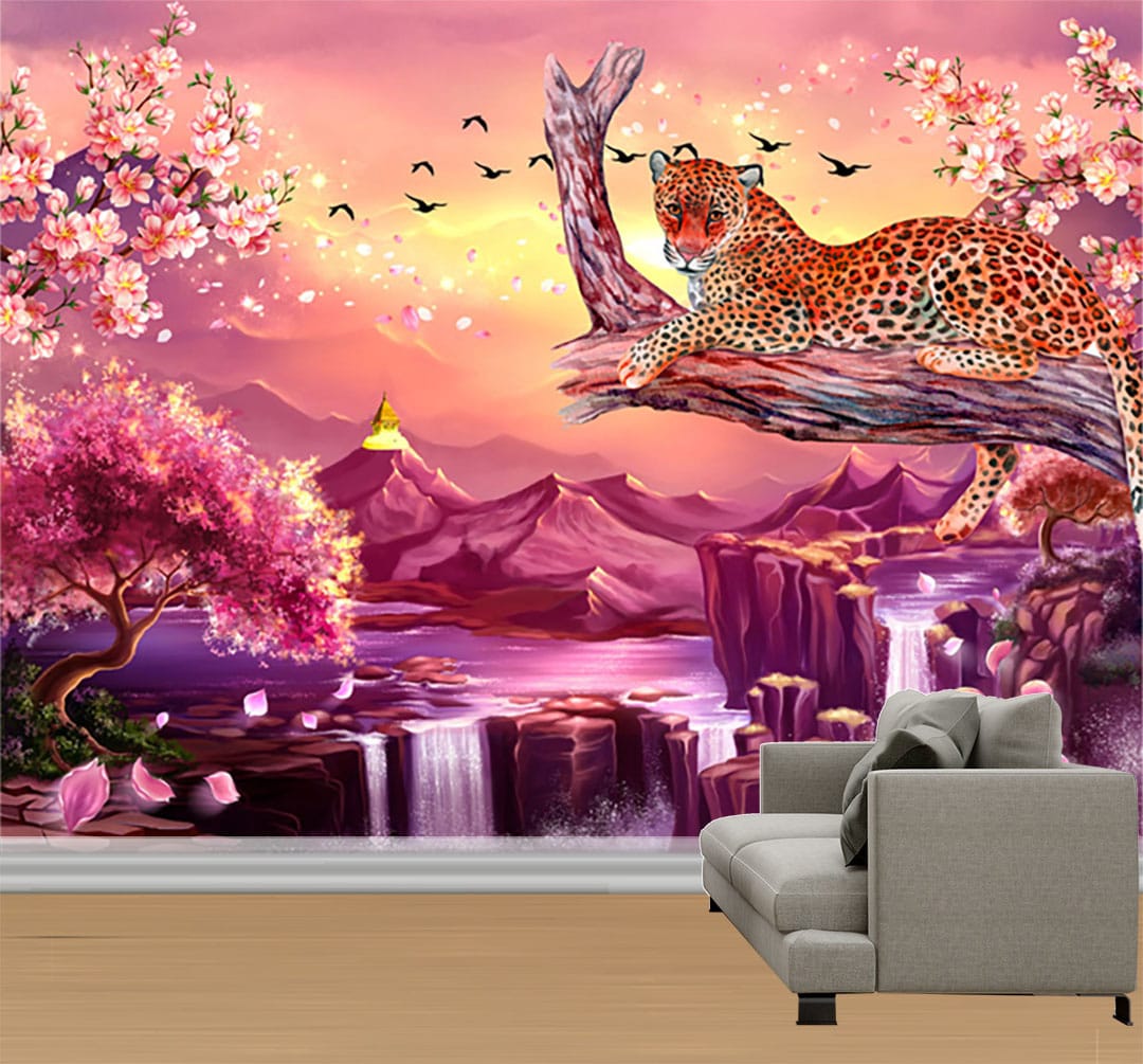 Transform your space with the serene Leopard Pink Landscape Mural Print. This artistic design features a majestic leopard gracefully resting on a branch overlooking a tranquil landscape bathed in soft pink and purple hues. Cherry blossom trees frame the scene, while gentle waterfalls cascade into a calm river. Birds fly in the distance, adding to the peaceful and dreamlike atmosphere.