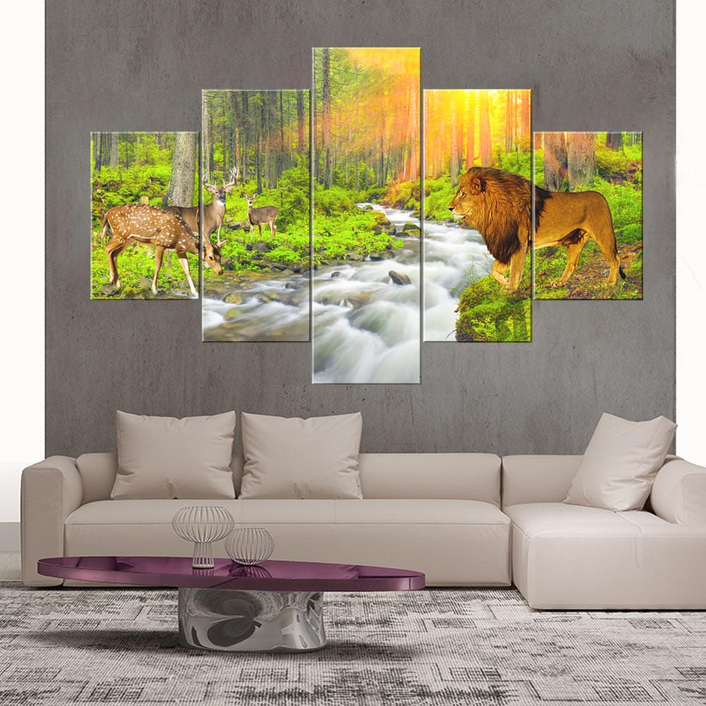 Lion and Deer Canvas Prints offer a captivating glimpse into the natural world. This set features five individual canvas prints that together form a stunning scene of a lion and deer in their natural habitat. The vibrant colors and detailed imagery create a visually striking and engaging atmosphere. This multi-panel set is perfect for wildlife enthusiasts and those looking to add a touch of nature’s drama to their living space. Crafted with high-quality materials, these canvas prints transform your walls into a window to the wild. Also, explore our collection of animal and nature canvas prints for more inspiring designs.