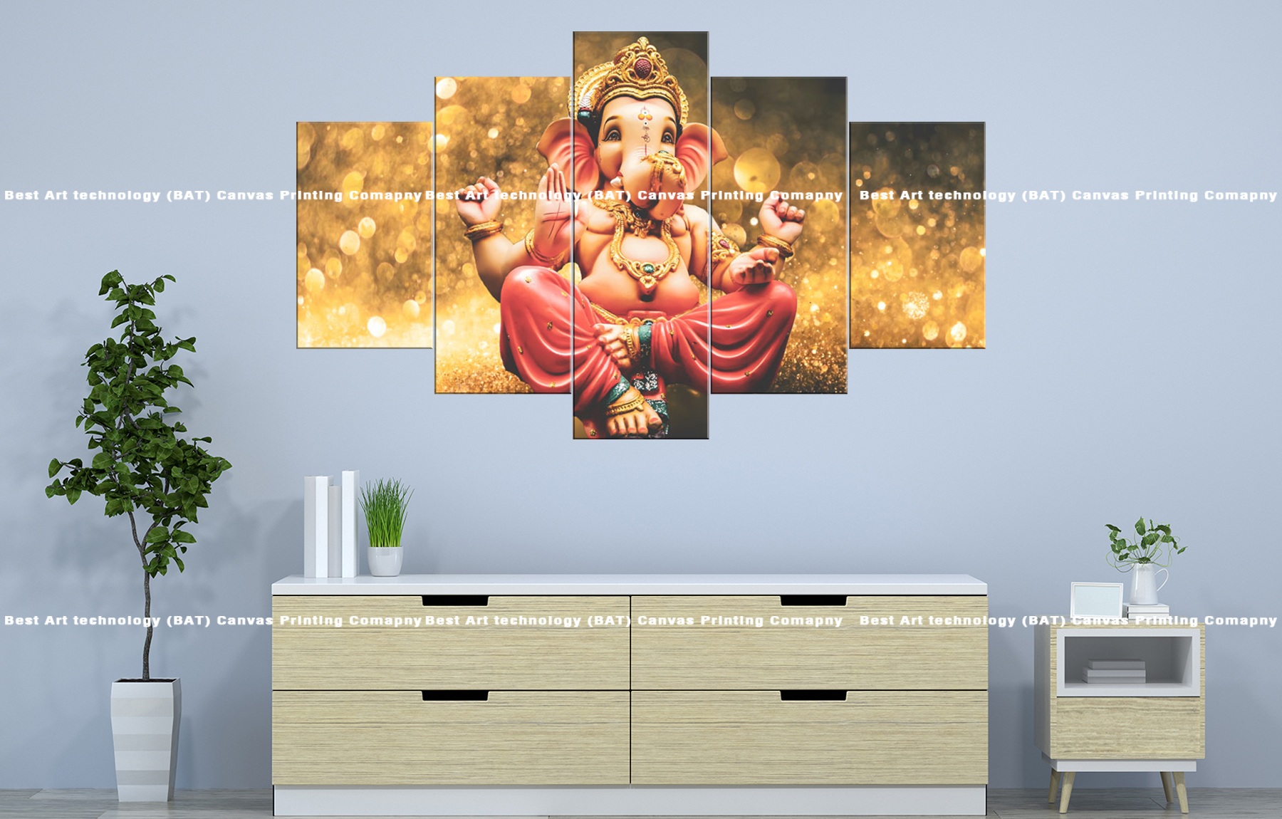 Transform your living room or prayer space with the Lord Ganesha Gold Light Canvas. This stunning multi-panel canvas print features Lord Ganesha, the remover of obstacles, radiating in a golden light, symbolizing prosperity and auspicious beginnings. The warm golden tones and detailed rendering of the deity create a spiritually uplifting atmosphere.