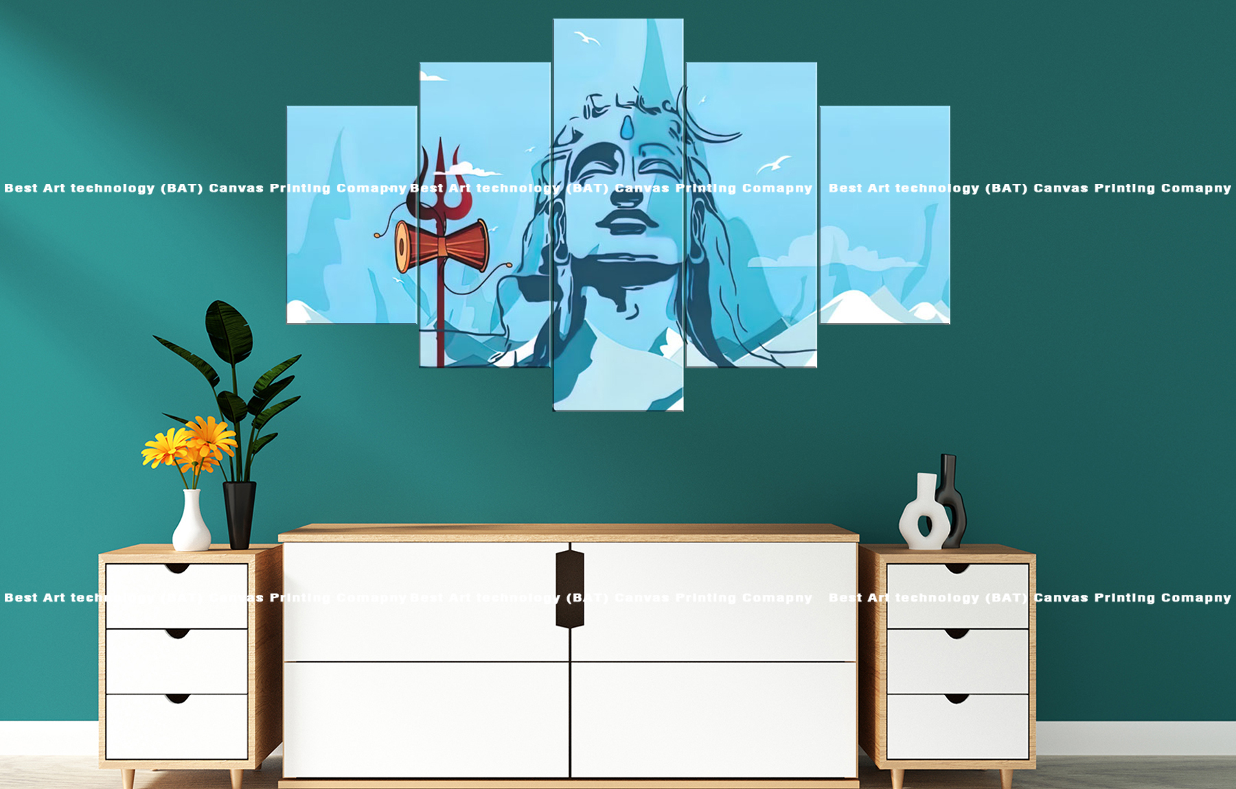 Transform your living room or meditation space with the Lord Shiva Artistic Canvas Print. This striking multi-panel canvas print features Lord Shiva’s serene face in a unique artistic interpretation, symbolizing peace, spiritual energy, and blessings. The cool blue tones and stylized rendering create a tranquil and powerful spiritual atmosphere.