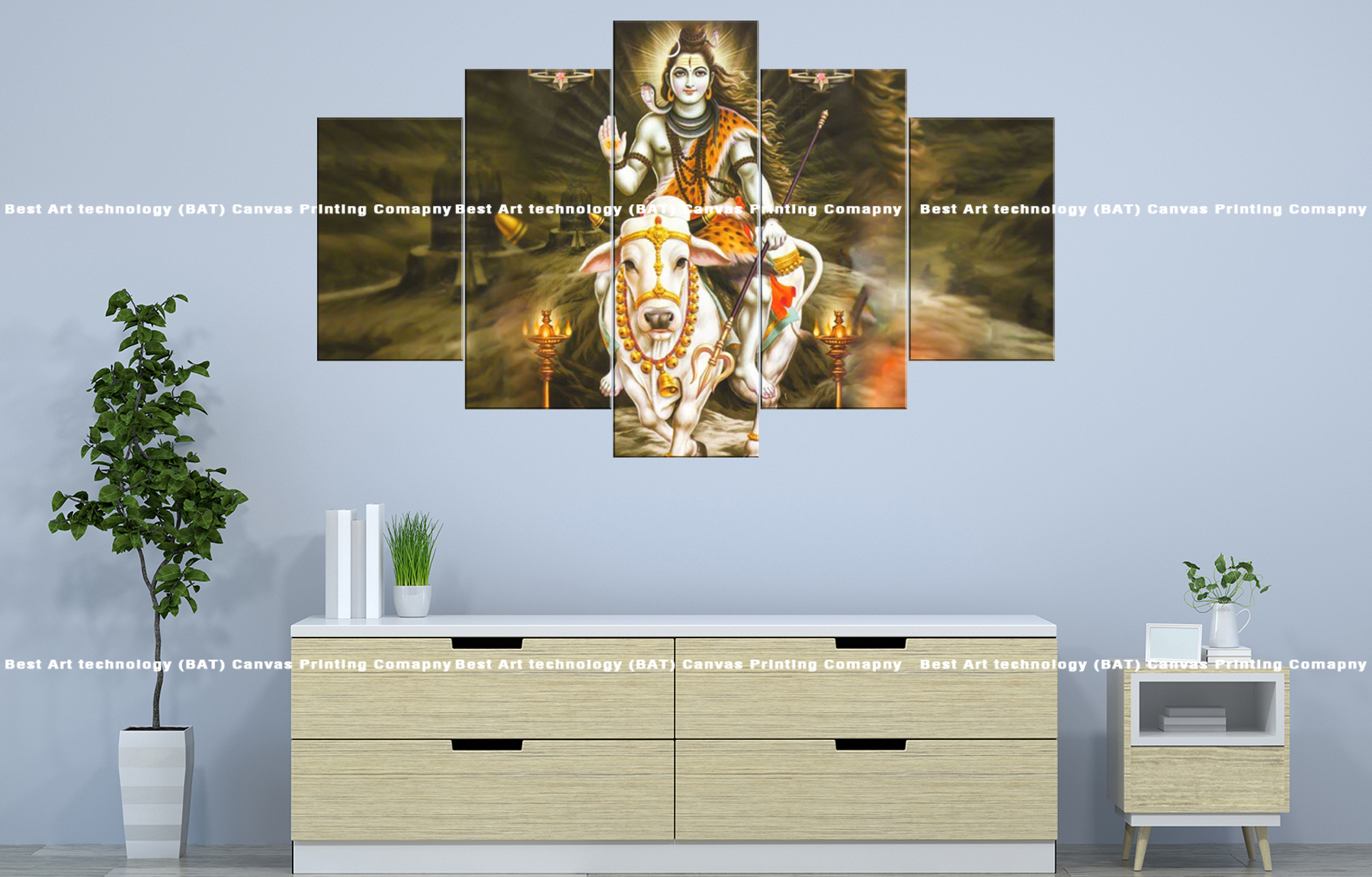 Transform your living room or prayer space with the Lord Shiva Nandi Ride Canvas Print. This striking multi-panel canvas print features Lord Shiva riding his divine bull, Nandi, symbolizing divine blessings, strength, and unwavering devotion. The vibrant colors and detailed rendering create a powerful and auspicious atmosphere.
