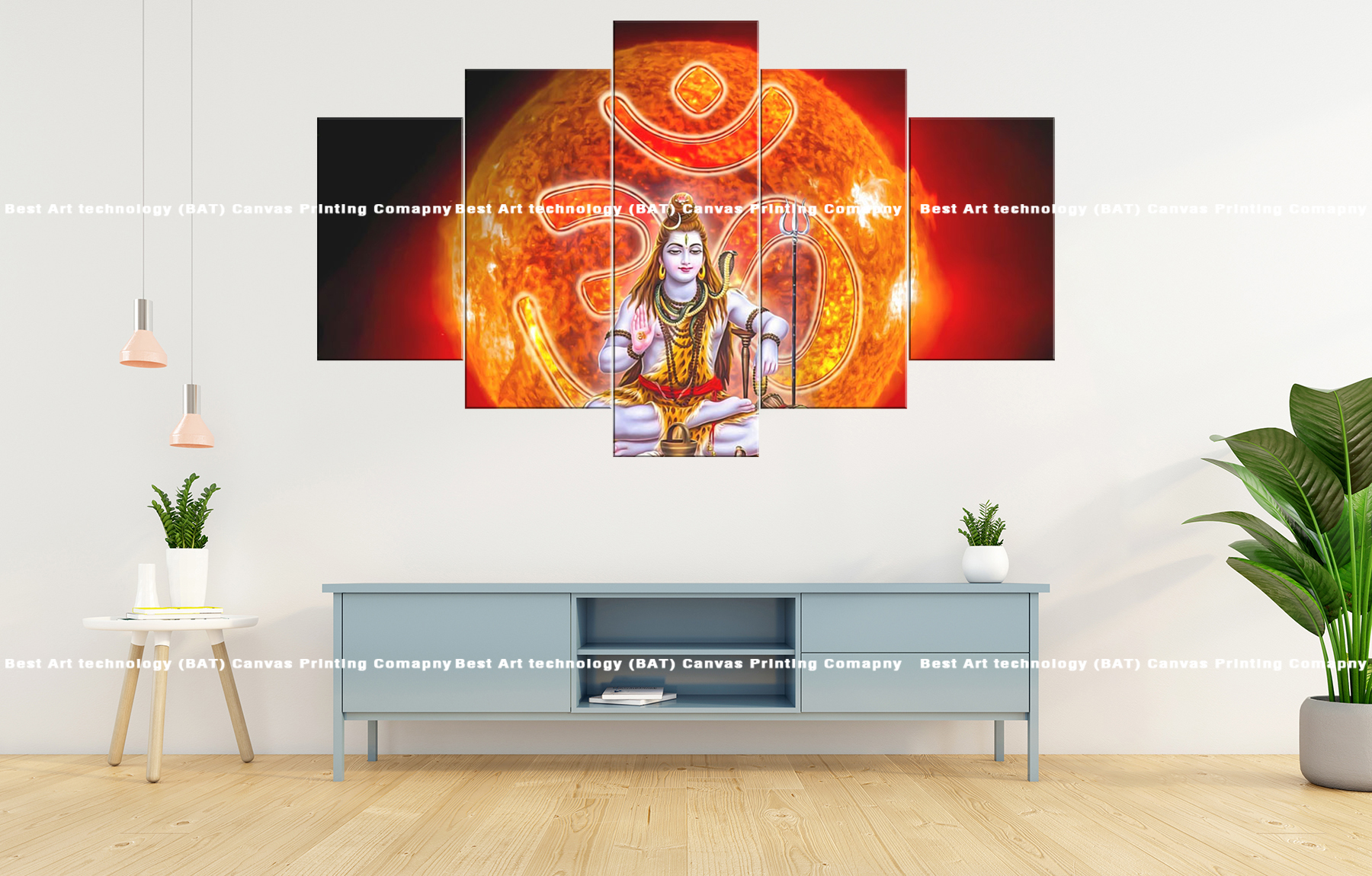 Transform your living room or prayer space with the Lord Shiva Sun Om Canvas Print. This striking multi-panel canvas print features Lord Shiva seated in a meditative pose, accompanied by the sacred Om symbol, against a vibrant sun backdrop, symbolizing divine blessings, cosmic energy, and protection. The bold colors and detailed rendering create a powerful and awe-inspiring spiritual atmosphere.