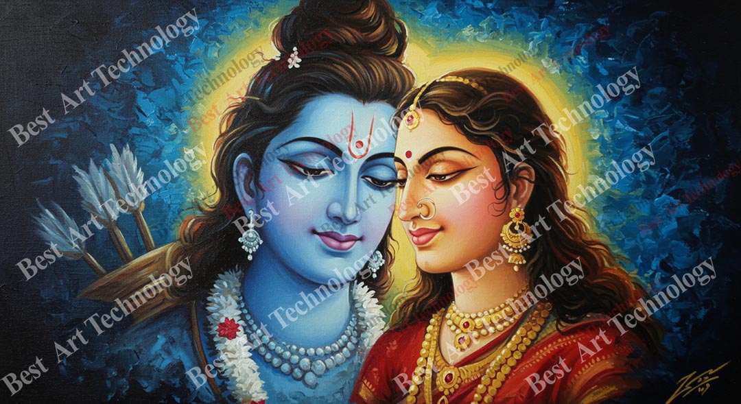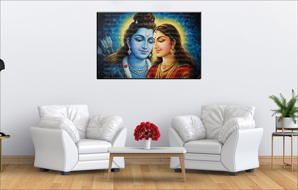 - High-Resolution Print: Captures the loving expressions of Rama and Sita and the soft, glowing details of the background.