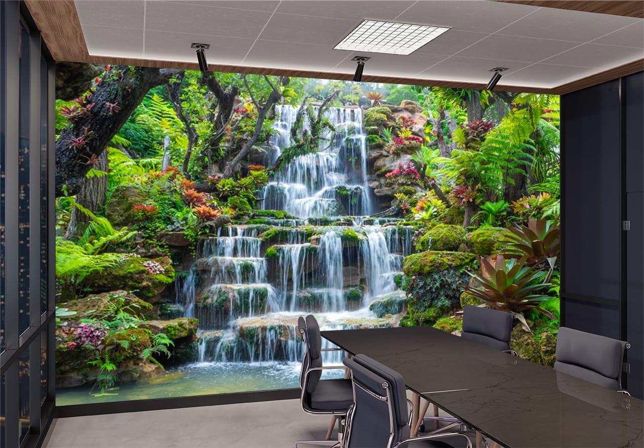 • Premium Quality Mural: High-resolution design showcasing multiple waterfalls cascading through a lush tropical jungle.