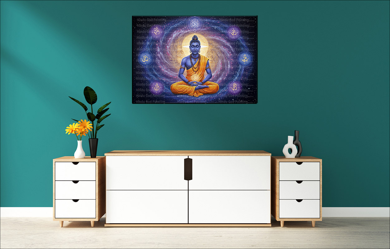 • High-Resolution Print: Captures the serene blue Buddha in meditation amidst the cosmic energy and Om symbols.