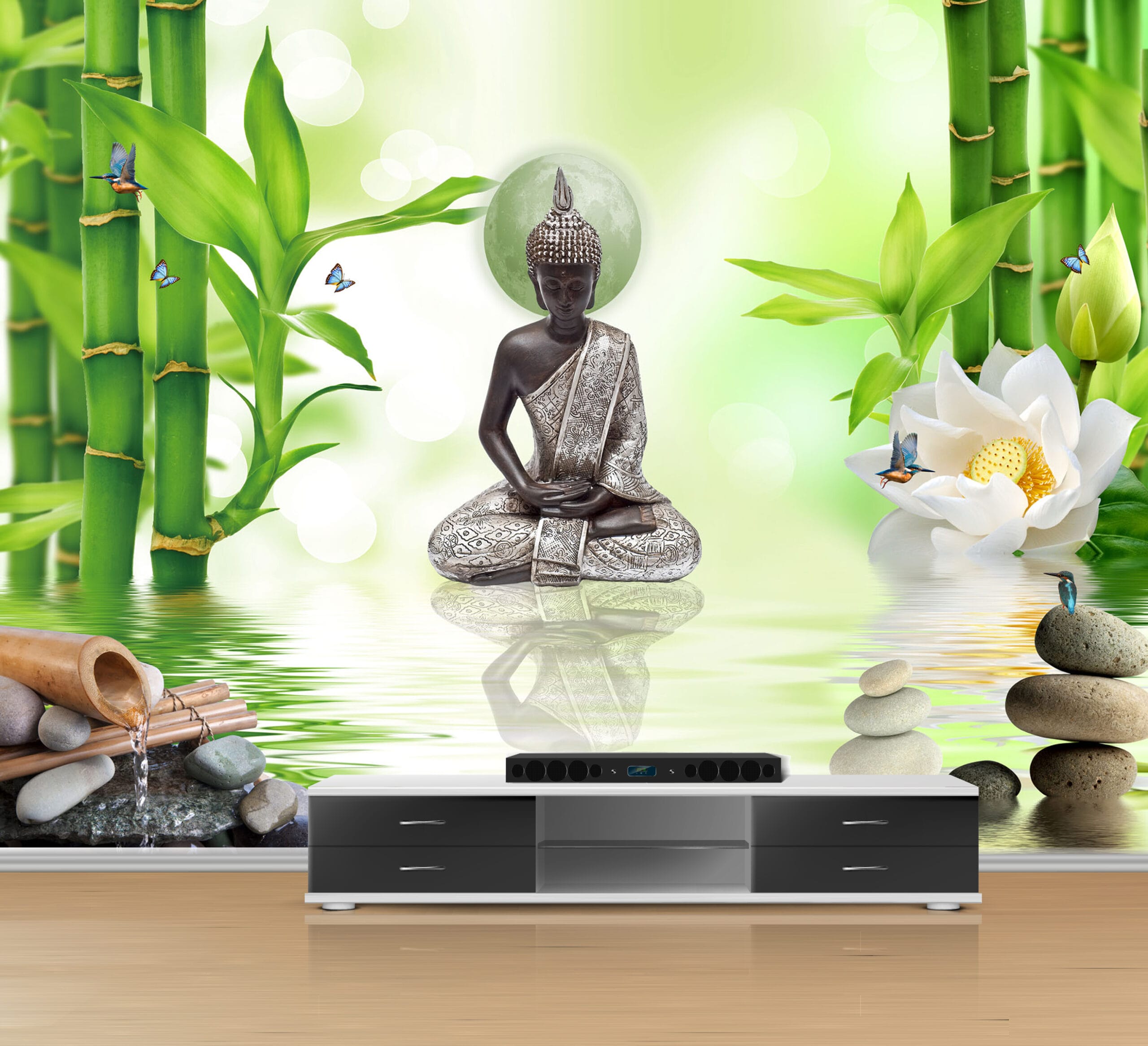 Transform your wall into a tranquil sanctuary with the Meditating Buddha Bamboo Mural Print. This beautiful mural depicts a serene Buddha statue in a meditative pose, surrounded by lush green bamboo, delicate butterflies, and calming water features. The peaceful imagery promotes relaxation, mindfulness, and a sense of well-being in any room.
