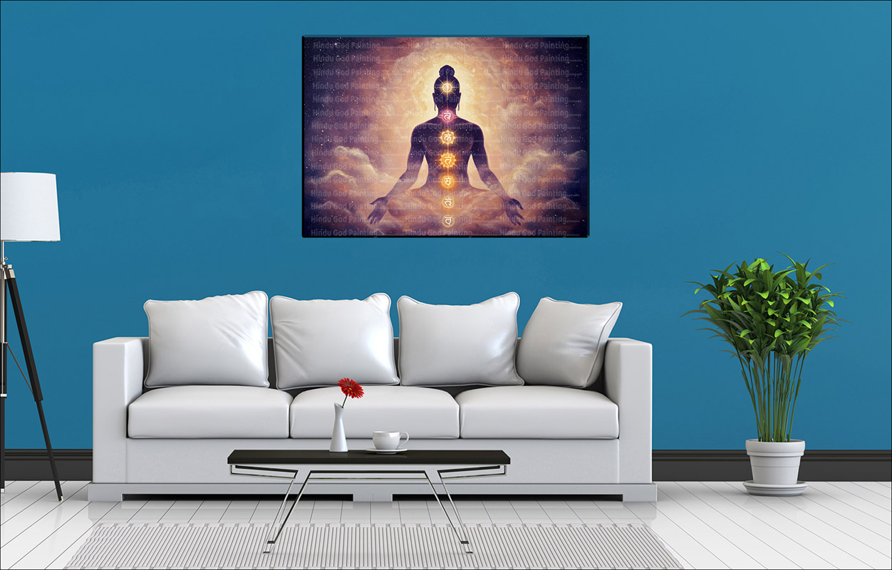 - High-Resolution Print: Captures the serene silhouette of the meditating figure with the detailed alignment of the seven chakras against the luminous cloudy background.