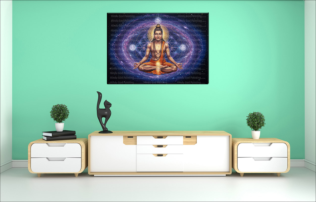 • High-Resolution Print: Captures the serene figure of Lord Shiva in meditation amidst the cosmic elements, Om symbols, and nebula.