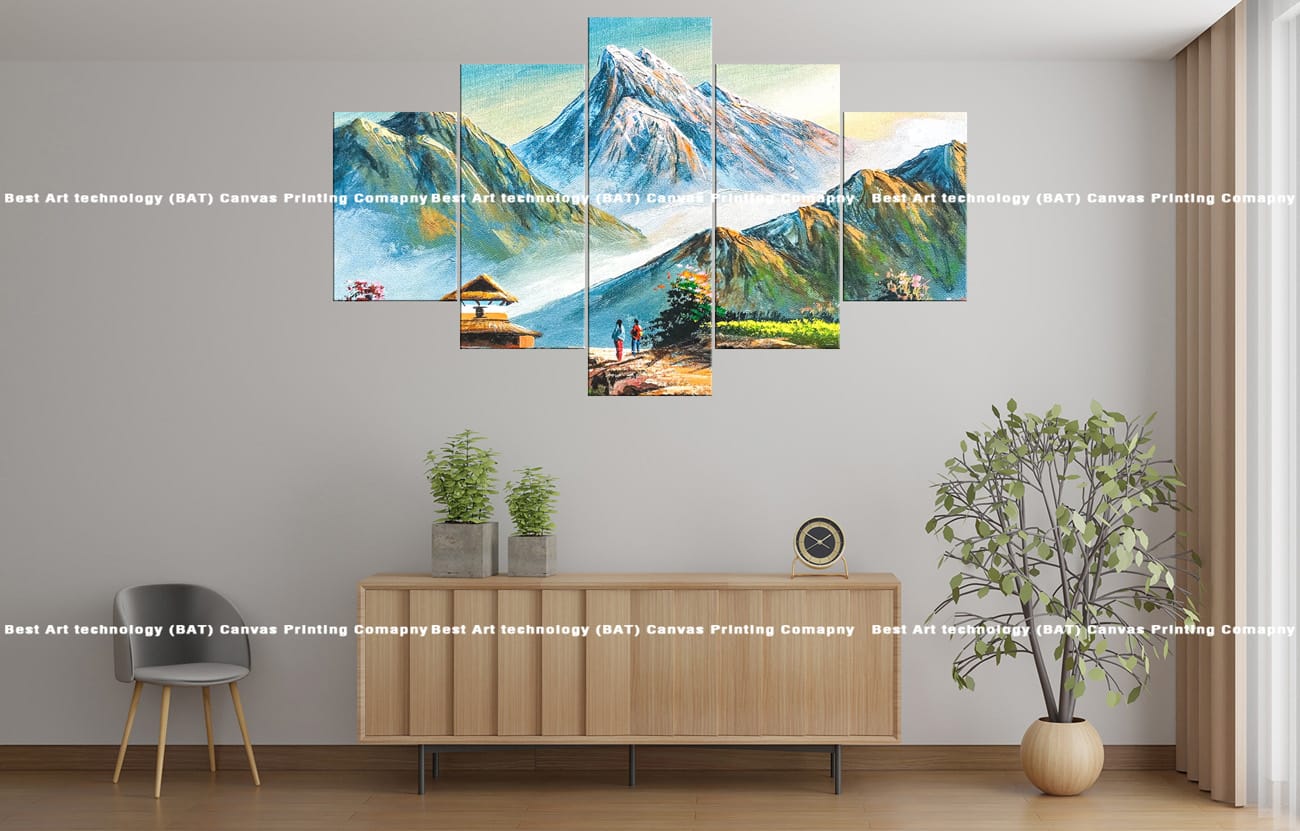 • Premium Quality Canvas Print: High-resolution multi-panel painting of a misty mountain scene in Nepal.