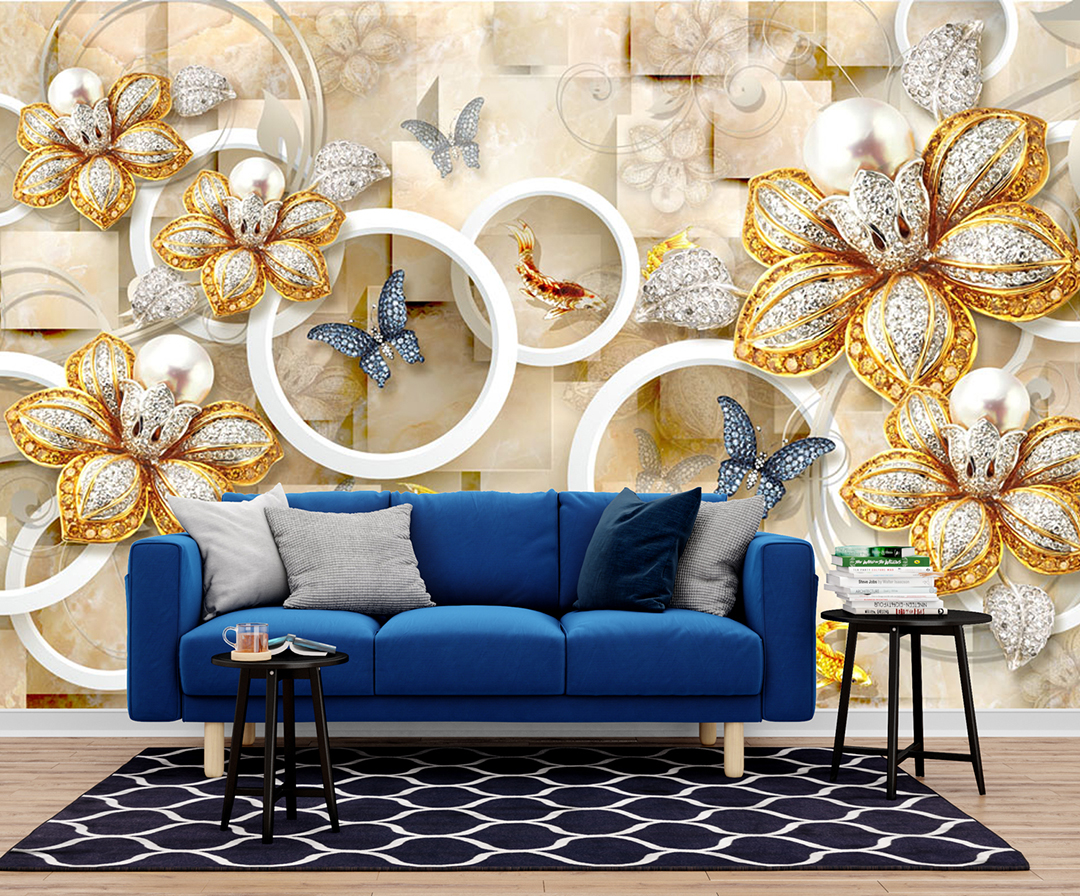 Introduce vibrant modernity and abstract floral beauty to your space with this multi-panel art featuring the Modern Abstract Floral Wall Mural. This captivating artwork creates the illusion of a textured wall adorned with large, ornate golden and white flowers, many embellished with shimmering pearls and diamonds, intertwined with modern white geometric circles and delicate butterflies, all set against a background of abstract, textured patterns.