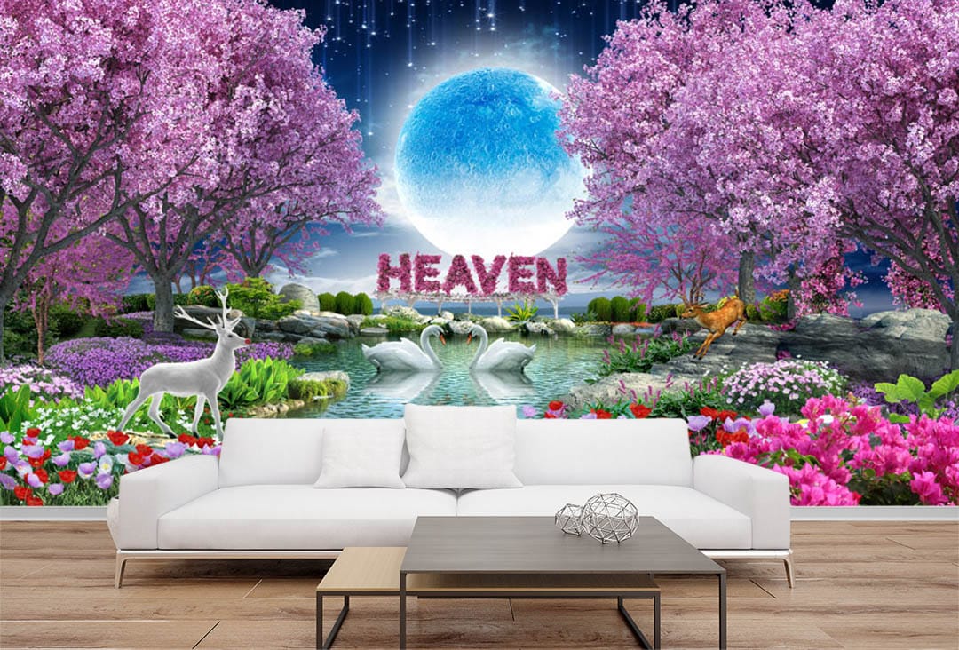 - Premium Quality Mural: High-resolution design showcasing a moonlit lake with blossoming trees, swans, deer, and the word “Heaven”.